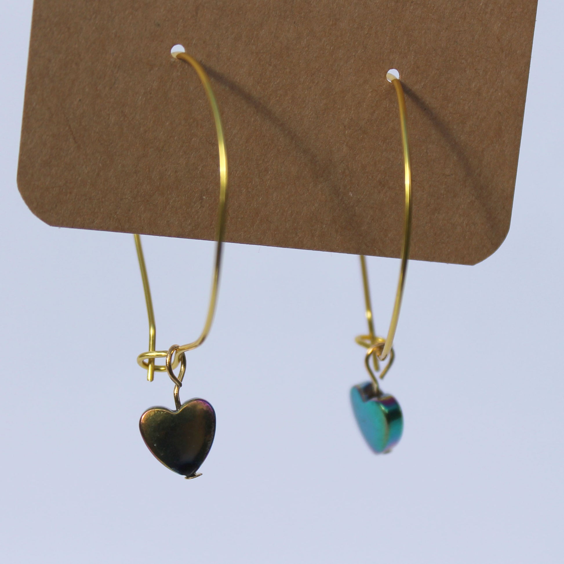 Iridescent hematite hearts on a gold hoop.
